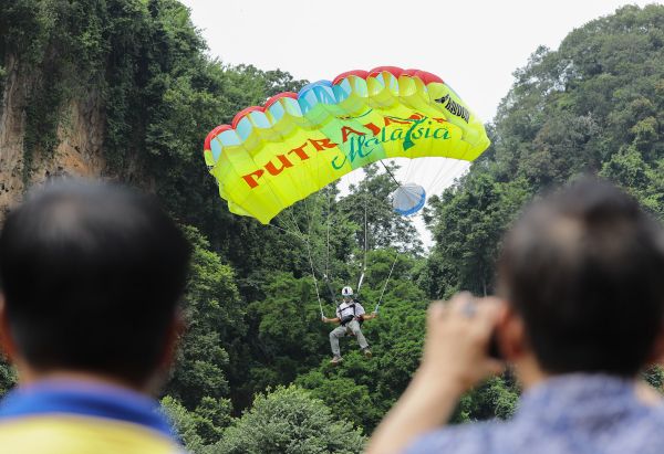 Penerjun luncur udara atau "para gliding" membuat persembahan ketika Majlis Penutup Karnival Ekstrem Gua Damai 2023 di Taman Ekstrem Gua Damai, Gombak pada 17 September 2023. Foto HAFIZ OTHMAN/SELANGORKINI