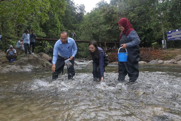 EXCO Alam Sekitar Jamaliah Jamaluddin (tengah) dan Pengarah Perhutanan Negeri Azhar Ahmad (kiri) serta Pengarah Jabatan Perikanan Negeri Noraisyah Abu Bakar (kanan) memberi makanan kepada pelbagai jenis ikan air tawar selepas Majlis Sambutan Hari Hutan Antarabangsa peringkat Negeri Selangor dan Penutup Mini Ekspidisi Biodiversiti Sungai Chiling di Pusat Santuari Ikan Kelah Sungai Chiling, Hulu Selangor pada 22 September 2023. Foto REMY ARIFIN/SELANGORKINI