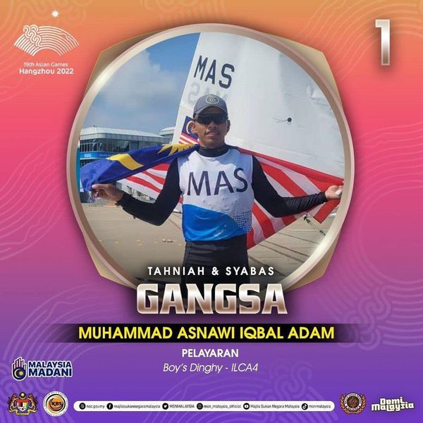 Penghormatan sebagai pemenang pingat pertama bagi Kontinjen negara pada Sukan Asia kali ini diterima pelayar berusia 17 tahun, Asnawi Iqbal Adam dalam acara ILCA 4 lelaki di Pusat Pelayaran Ningbo Xiangshan, lebih kurang 170 kilometer (km) dari sini.
