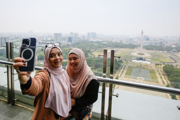 Pengujung berkesempatan berswafoto berlatarkan Monumen Nasional di Perpustakaan Nasional Republik Indonesia, Jakarta pada 26 September 2023. Dato' Menteri Besar Selangor membuat lawatan ke Perpustakaan Nasional Republik Indonesia dan menyertai majlis menandatangani memorandum persefahaman (MoU) di antara Perbadanan Perpustakaan Awam Selangor (PPAS) dan Perpustakaan Nasional Republik Indonesia (PERPUSNAS). Foto HAFIZ OTHMAN/SELANGORKINI