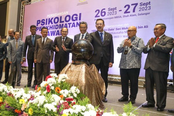 Ketua Setiausaha Negara Tan Sri Mohd Zuki Ali (tiga,kanan) melakukan gimik perasmian sempena majlis Persidangan Psikologi Perkhidmatan Awam ke-27 di MBSA Convention Centre, Shah Alam, pada 26 September 2023. Foto REMY ARIFIN/SELANGORKINI