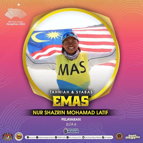 HANGZHOU, 27 SEPT: Malaysia berjaya merangkul pingat emas pertama pada temasya Sukan Asia Hangzhou 2022 menerusi pelayar, Nur Shazrin Mohamad Latif dalam acara ILCA 6 wanita pada hari keempat acara berpingat dipertandingkan di sini.