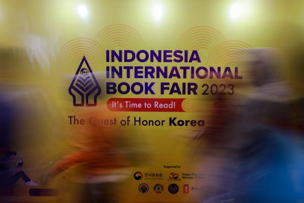 Pengujung melintasi di hadapan papan iklan Pesta Buku Antarabangsa Indonesia (IIBF) yang berlansung selama lima hari dari 27 September hingga 1 Oktober di Pusat Konvensyen Pameran Indonesia (ICE) BSD City, Jakarta pada 27 September 2023. Foto HAFIZ OTHMAN/SELANGORKINI