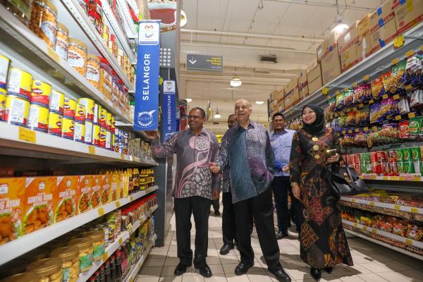 Pengarah Kanan, Sektor Perdagangan, Pengedaran dan Perniagaan, Kementerian Perdagangan Dalam Negeri dan Kos Sara Hidup Dato' Rohaizi Bohari (tengah) bersama Pengarah Urusan Mydin Mohamed Holdings Berhad (MYDIN) Datuk Ameer Ali Mydin (dua, kiri) merasmikan majlis Pelancaran Bangga Buatan Lokal sempena Kempen Beli Barangan Malaysia di Mydin USJ, Subang Jaya pada 29 September 2023. Foto FIKRI YUSOF/SELANGORKINI[/caption]