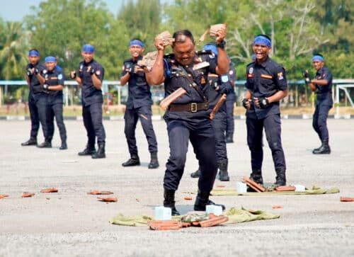 Pertunjukan Tempur Tanpa Senjata (TTS) ketika majlis perasmian penutup Tamat Latihan Kursus Asas Penguat Kuasa Selangor Siri 2/2023 di Pusat latihan Penguat Kuasa Selangor (PULAPES) Jugra, Banting pada 29 September 2023. Foto NUR ADIBAH AHMAD IZAM/SELANGORKINI