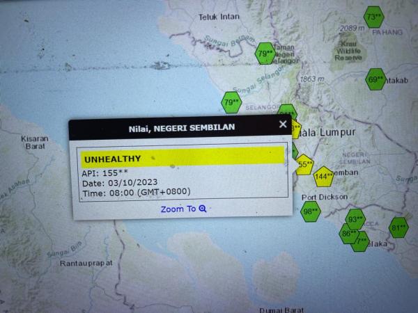 Laman sesawang Sistem Pengurusan Indeks Pencemaran Udara Malaysia (APIMS) mencatatkan bacaan IPU tertinggi direkodkan di Nilai 155, Cheras (153), Seremban (144) dan Banting (111).