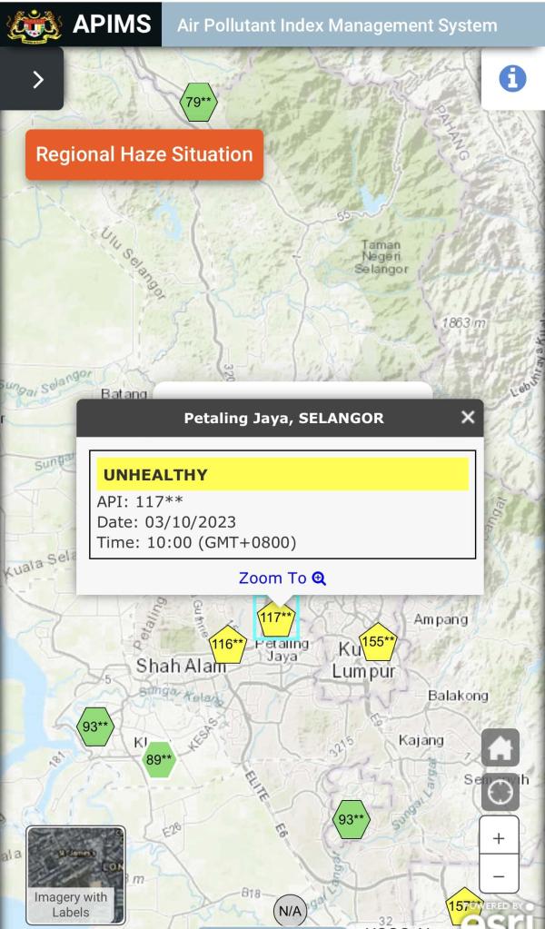 Menurut laman sesawang Sistem Pengurusan Indeks Pencemaran Udara Malaysia (APIMS), Banting merekodkan bacaan 125 meningkat berbanding 111 jam 8 pagi tadi, Petaling Jaya 117 daripada 99 dan Shah Alam, 116 berbanding 97.