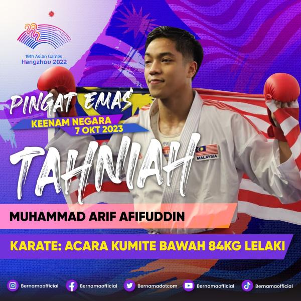 HANGZHOU, 8 OKT: Pengorbanan atlet karate kebangsaan, Muhammad Arif Afifuddin Ab Malik, yang menahan kesakitan akibat kecederaan lama dan baharu berjaya membutirkan satu lagi pingat emas berharga buat kontinjen Malaysia pada hari ke-14 Sukan Asia Hangzhou 2022, di sini.