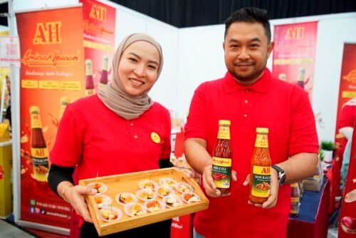 Saiful Bahari Zainal Abidin dan Zarini Ghazali menunjukkan produk sos pencicah Aminah Hassan ketika Ekspo Usahawan Selangor 2023 (SELBIZ 2023) anjuran Perbadanan Kemajuan Negeri Selangor (PKNS) di Pusat Konvensyen Setia City (SCCC), Shah Alam pada 7 Oktober 2023. Foto NUR ADIBAH AHMADIZAM/SELANGORKINI