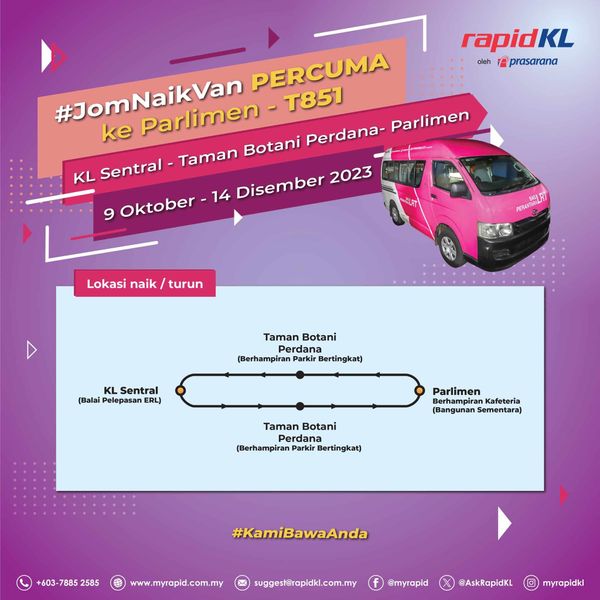 KUALA LUMPUR, 8 OKT: Perkhidmatan van perantara percuma (T851) dari KL Sentral ke bangunan Parlimen disediakan mulai esok hingga 14 Dis ini bagi mengatasi kekurangan tempat letak kereta ketika persidangan berlangsung.