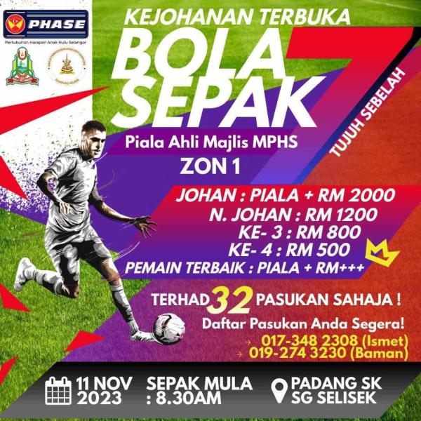 Bertempat di Padang Sekolah Sungai Selisek, kejohanan Piala Ahli MPHS Zon 1 yang dijadual bermula 8.30 pagi terhad kepada 32 pasukan.
