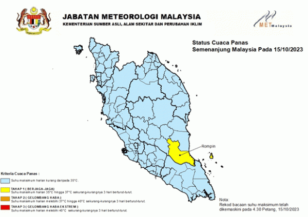 SHAH ALAM, 15 OKT: Jabatan Meteorologi Malaysia (MetMalaysia) mengeluarkan amaran cuaca panas tahap satu (berjaga-jaga) di Rompin, Pahang jam 4.30 petang hari ini.