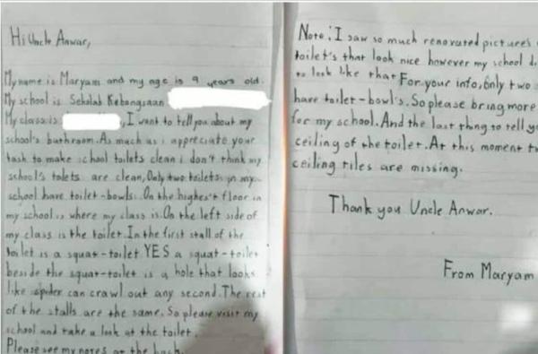 Menerusi catatan di Facebook hari ini Perdana Menteri mengucapkan terima kasih kepada seorang murid berusia sembilan tahun bernama Maryam yang menulis surat kepada beliau menceritakan keadaan tandas di sekolahnya.