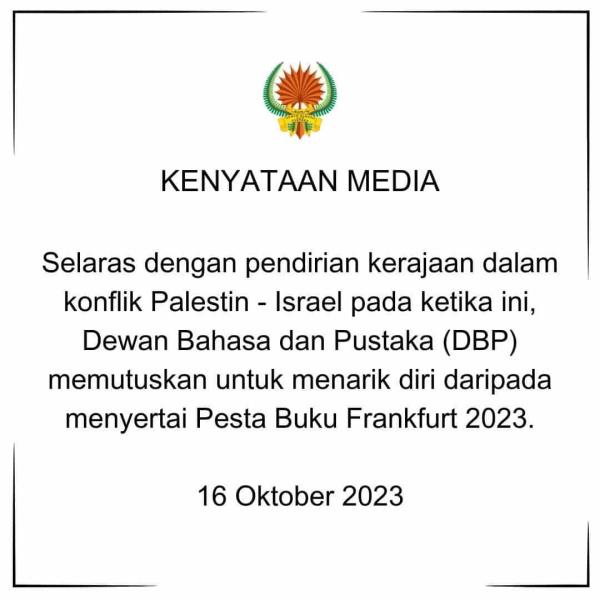 “Selaras dengan pendirian kerajaan dalam konflik Palestin-Israel pada ketika ini, DBP memutuskan untuk menarik diri daripada Pesta Buku Frankfurt 2023,” katanya.