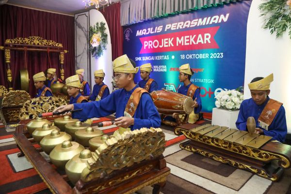 Pelajar mempersembahkan muzik Gamelan ketika majlis Perasmian Projek Mekar di Sekolah Menengah Kebangsaan Sungai Kertas, Gombak pada 18 Oktober 2023. Foto FIKRI YUSOF/SELANGORKINI