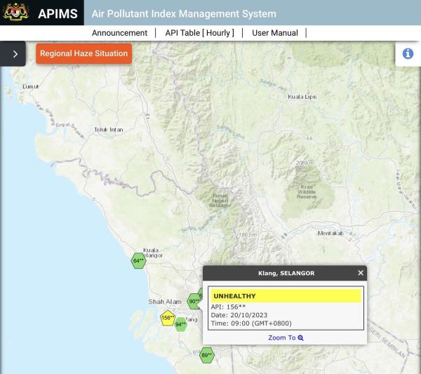 SHAH ALAM, 20 OKT: Klang satu-satunya kawasan mencatatkan Indeks Pencemaran Udara (IPU) tidak sihat setakat 9 pagi ini dengan bacaan 156.