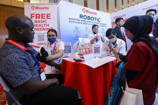 Pembantu perubatan Asunta Hospital melakukan ujian saringan kesihatan secara percuma ketika Sidang Kemuncak Perniagaan Antarabangsa Selangor (SIBS) di Pusat Konvensyen Kuala Lumpur (KLCC) pada 21 Oktober 2023. Foto HAFIZ OTHMAN/SELANGORKINI