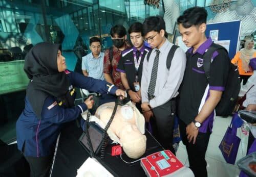 Fadzriatul Hafinaz Alias (kiri) memberi penerangan kepada pelajar mengenai mesin defibrilator sempena Program Masyarakat Sihat (MaSIH) dan Sambutan Hari Jantung Sedunia 2023 di Hospital Al-Sultan Abdullah (HASA) Puncak Alam, Kuala Selangor pada 26 Oktober 2023. Foto AHMAD ZAKKI JILAN/SELANGORKINI