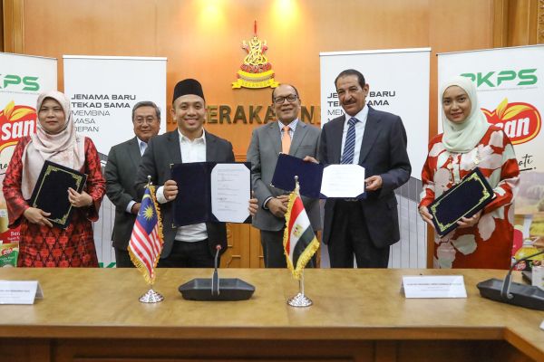 Ketua Pegawai Eksekutif Perbadanan Kemajuan Pertanian Selangor (PKPS) Dr Mohamad Khairil Mohamad Razi (tiga,kiri) dan Pengarah Urusan Green For Agricultural Manufacturing Sdn Bhd Elsayed Mohamed Abdelgawwad Elnaggar (dua,kanan) menunjukkan memorandum persefahaman (MoU) yang dimeterai kedua-dua pihak disaksikan EXCO Industri Asas Tani Ir Izham Hashim (tiga,kanan) dan Setiausaha Kerajaan Negeri Dato’ Haris Kasim (dua,kiri) di pusat pentadbiran rasmi Kerajaan Negeri, Shah Alam pada 27 Oktober 2023. Foto REMY ARIFIN/SELANGORKINI