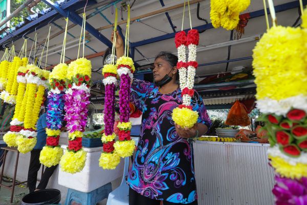 P. Kasturi menyusun kalungan bunga malai pelbagai saiz dan warna untuk dijual kepada orang ramai bagi persiapan sambutan perayaan Deepavali di Little India, Jalan Tengku Kelana, Klang pada 2 November 2023. Foto HAFIZ OTHMAN/SELANGORKINI
