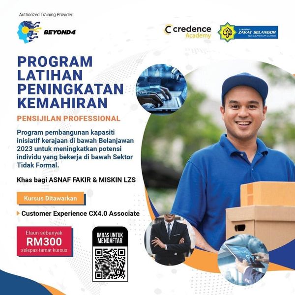 “Jangan lepaskan peluang menyertai Kursus Tajaan Penuh Pensijilan Customer Experience CX4.0 Associate. Kami menyasarkan pekerja gig, usahawan, peniaga sambilan, orang bekerja sendiri, dan mereka yang mencari pekerjaan.
