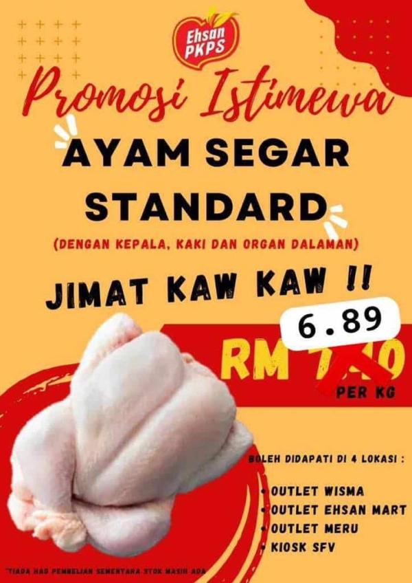 "Penjimatan berganda. Jom beli ayam segar di outlet PKPS, tiada had pembelian," maklumnya di Facebook.