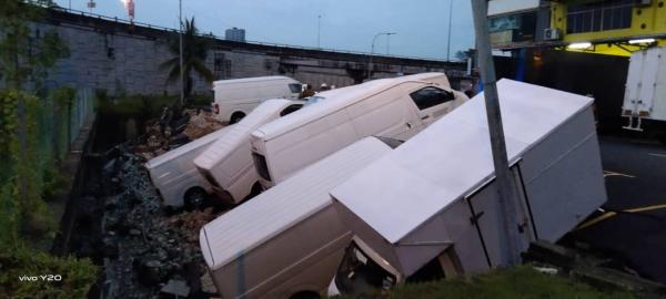 KUALA LUMPUR, 13 NOV: Sebanyak enam van dan sebuah lori terjejas akibat mendapan tanah di kawasan tempat letak kenderaan Majlis Bandaraya Subang Jaya (MBSJ), Bandar Puchong Utama 6, dekat sini, petang tadi.