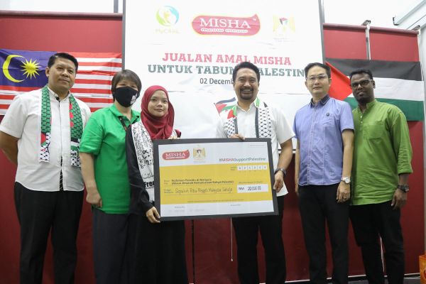ADN Pelabuhan Klang Azmizam Zaman Huri (tiga, kanan) mewakili pihak Misha Sdn Bhd menyerahkan sumbangan Tabung Akaun Amanah Kemanusiaan Rakyat Palestin berjumlah RM10,000 kepada Pegawai Perhubungan Awam Kedutaan Palestin di Malaysia Nur Fatimah Amran (tiga, kiri) di Menara Misha, Pelabuhan Klang, Klang pada 2 Disember 2023. Foto REMY ARIFIN/SELANGORKINI