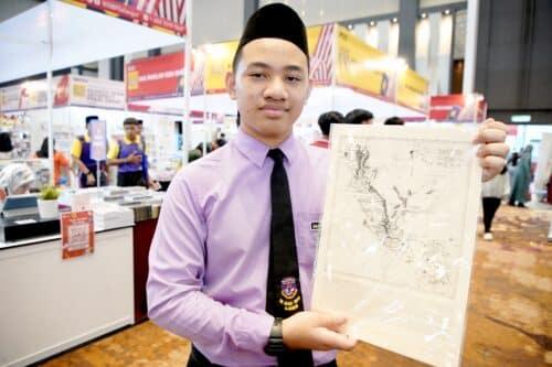 Mohd Iman Miqhail Mohd Shaufi dari Sekolah Menengah Agama Tinggi Al Rahman menunjukkan peta Malaysia yang dibeli ketika Pesta Buku Antarabangsa Selangor (SIBF) 2023 yang berlangsung di Pusat Konvensyen Majlis Bandaraya Shah Alam (MBSA) pada 5 Disember 2023. Foto NUR ADIBAH AHMAD IZAM/SELANGORKINI