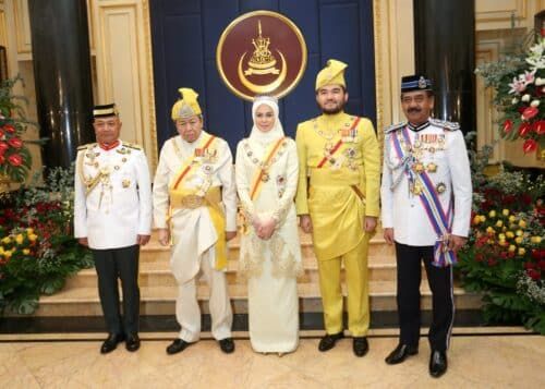 Duli Yang Maha Mulia (DYMM) Sultan Selangor Sultan Sharafuddin Idris Shah Alhaj, DYMM Tengku Permaisuri Selangor Tengku Permaisuri Hajah Norashikin dan DYTM Raja Muda Selangor Tengku Amir Shah berkenan bergambar bersama Panglima Angkatan Tentera Jeneral Tan Sri Mohammad Ab Rahman (kiri) dan Ketua Polis Negara Tan Sri Razaruddin Husain (kanan) sempena Hari Keputeraan ke-78 di Balairung Seri, Istana Alam Shah, Klang pada 11 Disember 2023. Foto AHMAD ZAKKI JILAN/SELANGORKINI