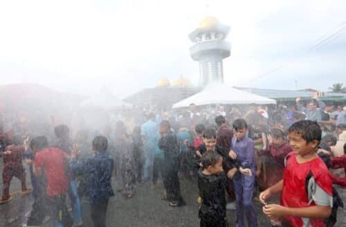 Kanak-kanak gembira disiram air oleh anggota bomba dan penyelamat pada program Grand Sunathon 2023 Parlimen Hulu Langat di Masjid Raja Muda Musa, Semenyih, Hulu Langat pada 24 Disember 2023. Foto AHMAD ZAKKI JILAN/SELANGORKINI