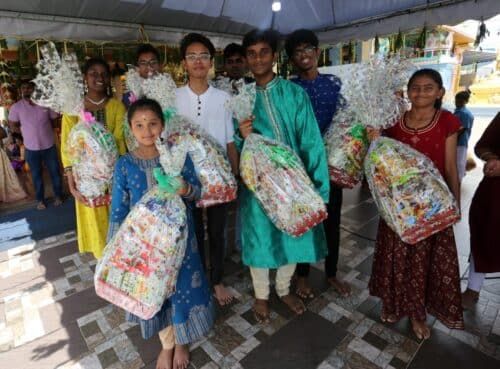 Sebahagian pelajar gembira setelah menerima hamper pada majlis sempena sambutan tahun baharu di Kuil Sri Ramar Alayam, Selayang Baru, Gombak pada 1 Januari 2024. Foto AHMAD ZAKKI JILAN/SELANGORKINI