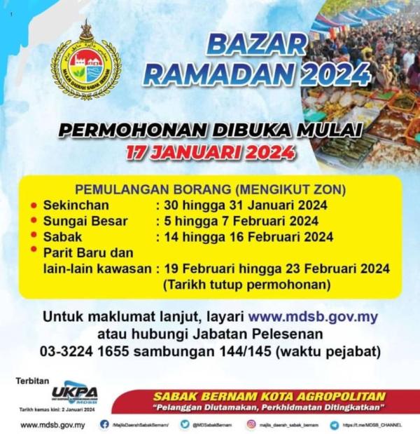 SHAH ALAM, 10 JAN: Majlis Daerah Sabak Bernam (MDSB) membuka permohonan permit tapak bazar Ramadan 2024 secara dalam talian dari 17 Januari hingga 23 Februari depan.