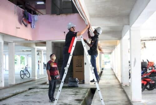 Pelajar jurusan elektrik Pusat Pembangunan Kemahiran Teknikal Selangor (STDC) membetulkan pendawaian yang rosak ketika program pembaikan sistem elektrik dan lampu di Pangsapuri Seri Rinching, Semenyih, Hulu Langat pada 10 Januari 2024. Foto AHMAD ZAKKI JILAN/SELANGORKINI