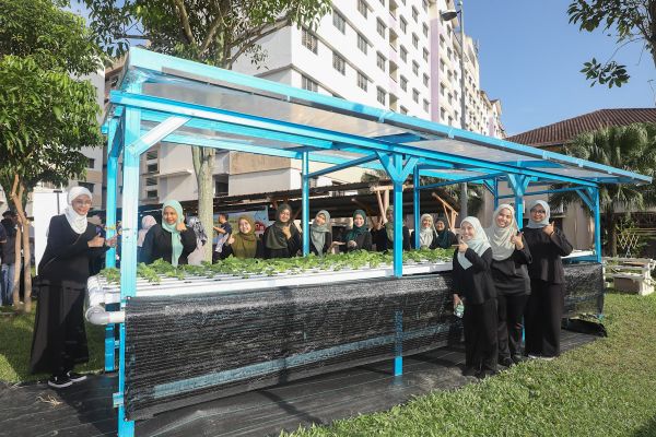 Sekumpulan pelajar menunjukkan sayuran yang ditanam secara hidroponik selepas majlis perasmian Eco Melati Garden di Kolej Melati, UiTM Shah Alam pada 13 Januari 2024. Foto REMY ARIFIN/SELANGORKINI