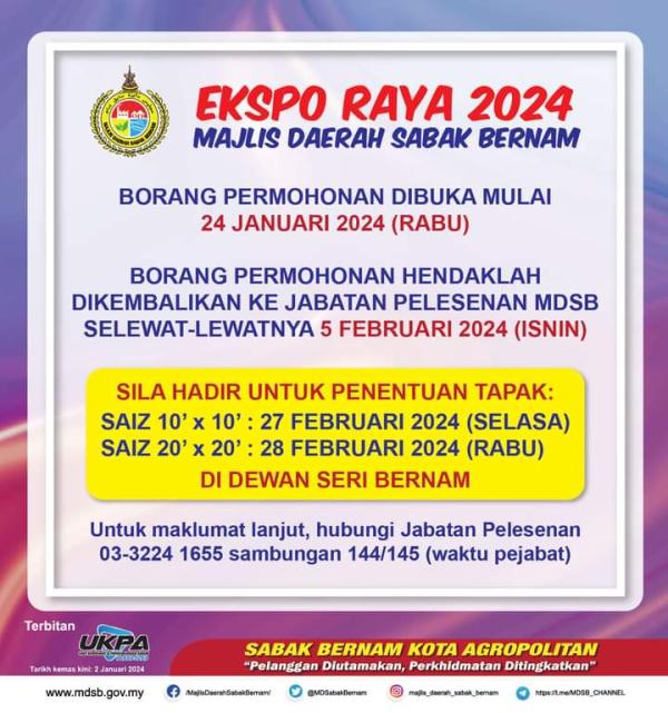 SHAH ALAM, 18 JAN: Majlis Daerah Sabak Bernam (MDSB) menyediakan ruang dan peluang kepada peniaga untuk menyertai Ekspo Raya 2024 selama 20 hari mulai 22 Mac di Stadium Sungai Besar.