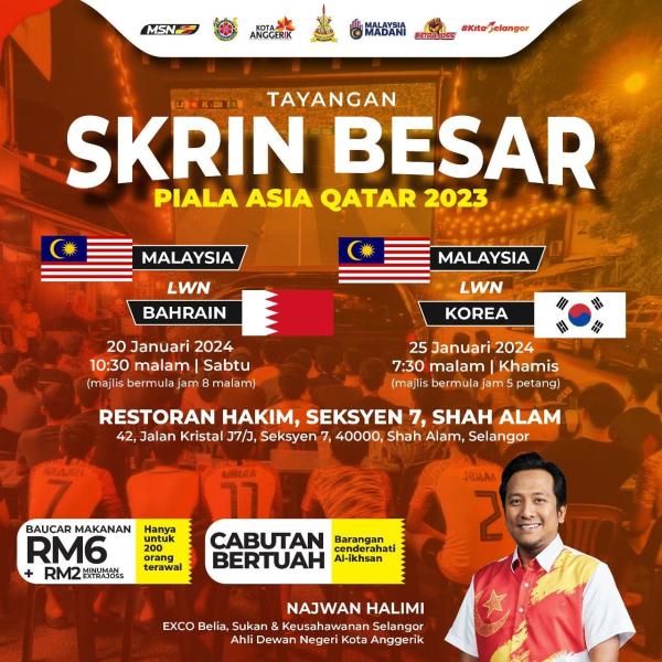 “Ayuh kita zahirkan sokongan kepada pasukan Harimau Malaya di program tayangan skrin besar Piala Asia 2023 anjuran pejabat EXCO Sukan Negeri Selangor pada 20 dan 25 Januari ini di Restoran Hakim, Seksyen 7.