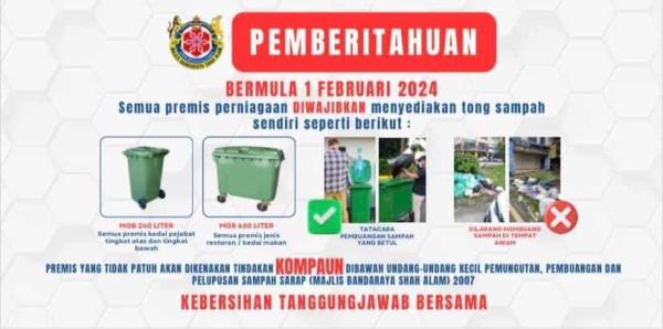 SHAH ALAM, 22 JAN: Semua premis perniagaan di kawasan pentadbiran Majlis Bandaraya Shah Alam (MBSA) diwajibkan menyediakan tong sampah sendiri mulai 1 Februari.