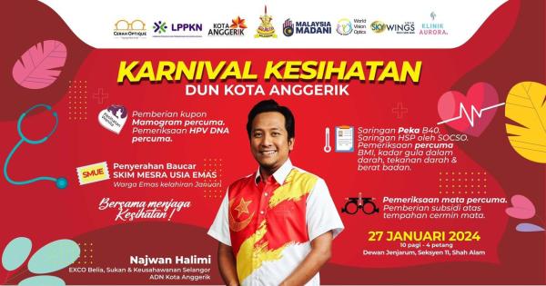 "Selain itu, potongan harga cermin mata akan diberikan. Saringan kesihatan ini adalah percuma bagi yang layak,” kata Najwan Halimi menerusi Facebook.