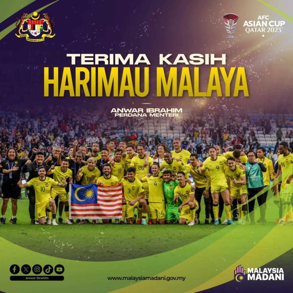 KUALA LUMPUR, 25 JAN: Perdana Menteri, Datuk Seri Anwar Ibrahim menzahirkan ucapan tahniah kepada pasukan Harimau Malaya yang berjaya memberikan tentangan sengit kepada Korea Selatan pada perlawanan terakhir Kumpulan E saingan Piala Asia 2023 di Stadium Al Janoub, Doha, Qatar, malam ini.