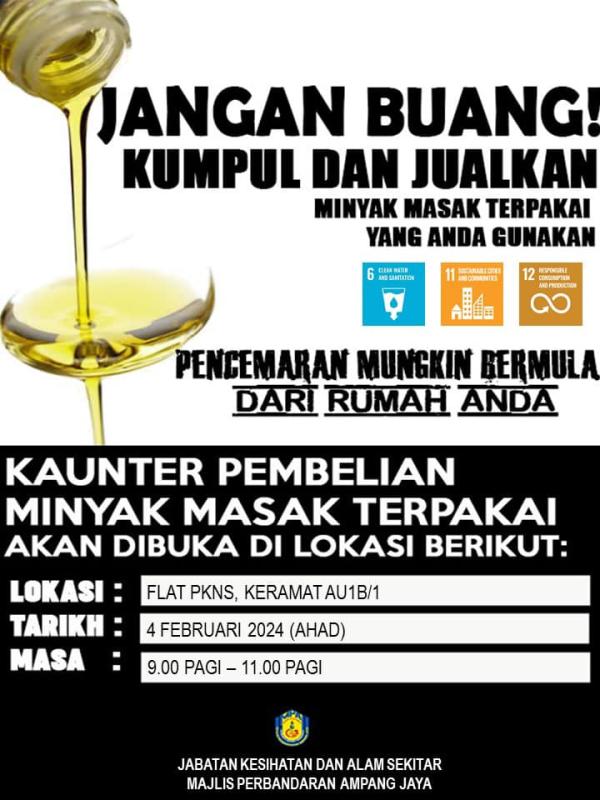 SHAH ALAM, 1 FEB: Majlis Perbandaran Ampang Jaya (MPAJ) membuka kaunter pengumpulan minyak masak terpakai dan e-sisa pada Sabtu dan Ahad ini, bermula jam 9 hingga 11 pagi dan 11.30 pagi hingga 1 tengah hari.