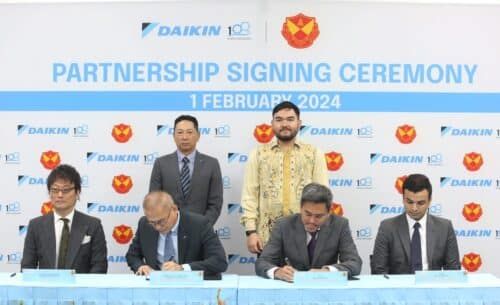 DYTM Raja Muda Selangor Tengku Amir Shah (berdiri, kanan) berkenan menyaksikan majlis menandatangani Kerjasama Strategik antara Selangor FC diwakili oleh ketua pegawai eksekutifnya Dr Johan Kamal Hamidon (duduk, dua kanan) dan Pengarah Urusan Daikin Malaysia Lawrence Song Yew Beng (duduk, dua kiri) bagi pihak Daikin Malaysia Sales & Service Sdn Bhd (DMSS) di Daikin Malaysia, Sungai Buloh, Shah Alam pada 1 Februari 2024. Foto AHMAD ZAKKI JILAN/SELANGORKINI