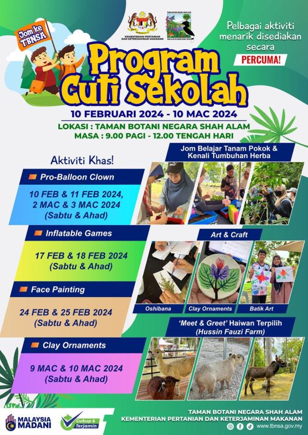 SHAH ALAM, 10 FEB: Taman Botani Negara Shah Alam (TBNSA) menyediakan pelbagai aktiviti menarik secara percuma sepanjang cuti sekolah mulai hari ini.