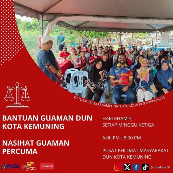SHAH ALAM, 14 FEB: Pusat Khidmat DUN Kota Kemuning menawarkan nasihat guaman percuma pada setiap Khamis minggu ketiga, bermula jam 6 petang hingga 8 malam.