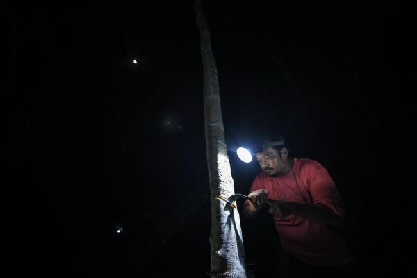 "Kalau menoreh pada waktu siang, pukul 9 pagi terpaksa berhenti sebab cuaca terlalu panas, kalau malam kami boleh menoreh lama sikit dan banyak pokok boleh ditoreh, hasil pun akan bertambah," katanya.