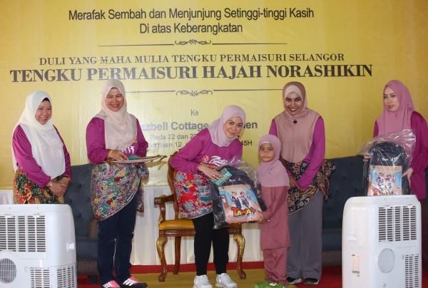 Tengku Permaisuri Hajah Norashikin diiringi Yang Dipertua Pekawanis Datin Seri Masdiana Muhamad turut berkenan menyampaikan sumbangan wang tunai kepada 30 ibu tunggal sempena program Ziarah Kasih Pekawanis ke Anjung Utara Selangor di Parit Lapan, Sungai Panjang di sini.