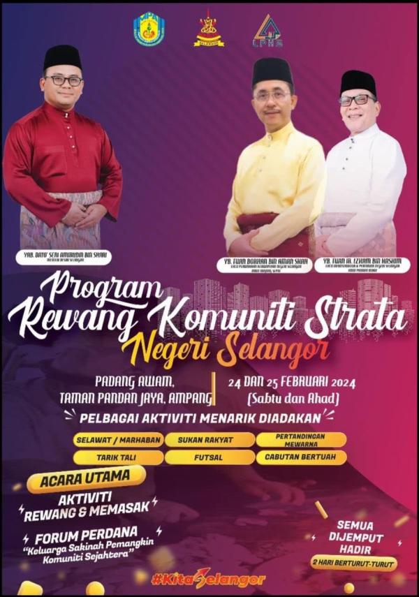 SHAH ALAM, 23 FEB: Dato’ Menteri Besar mempelawa orang ramai memeriahkan program rewang anjuran Kerajaan Negeri di Padang Awam, Taman Pandan Jaya, Ampang esok dan Ahad ini.