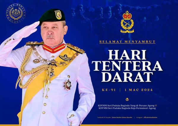 KUALA LUMPUR, 1 MAC: Yang di-Pertuan Agong Sultan Ibrahim hari ini menzahirkan ucapan selamat menyambut Hari Tentera Darat ke-91 kepada seluruh warga Tentera Darat (TDM) dan veteran.