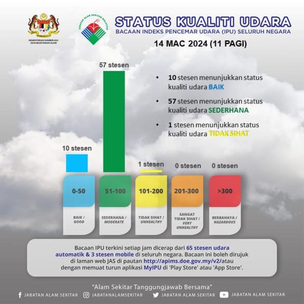 Sementara itu Facebook Jabatan Alam Sekitar melaporkan 10 stesen udara di seluruh negara menunjukkan status kualiti udara baik, 57 stesen sederhana dan satu tidak sihat iaitu Kimanis setakat 11 pagi tadi.
