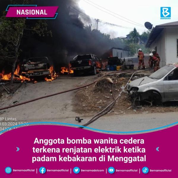 KOTA KINABALU, 20 MAC: Seorang anggota bomba wanita dari Balai Bomba dan Penyelamat (BBP) Lintas mengalami kecederaan selepas terkena renjatan elektrik ketika memadam kebakaran di Kampung Keliangau 2, Tebobon, Menggatal dekat sini hari ini.